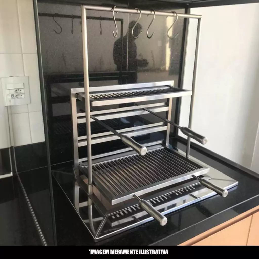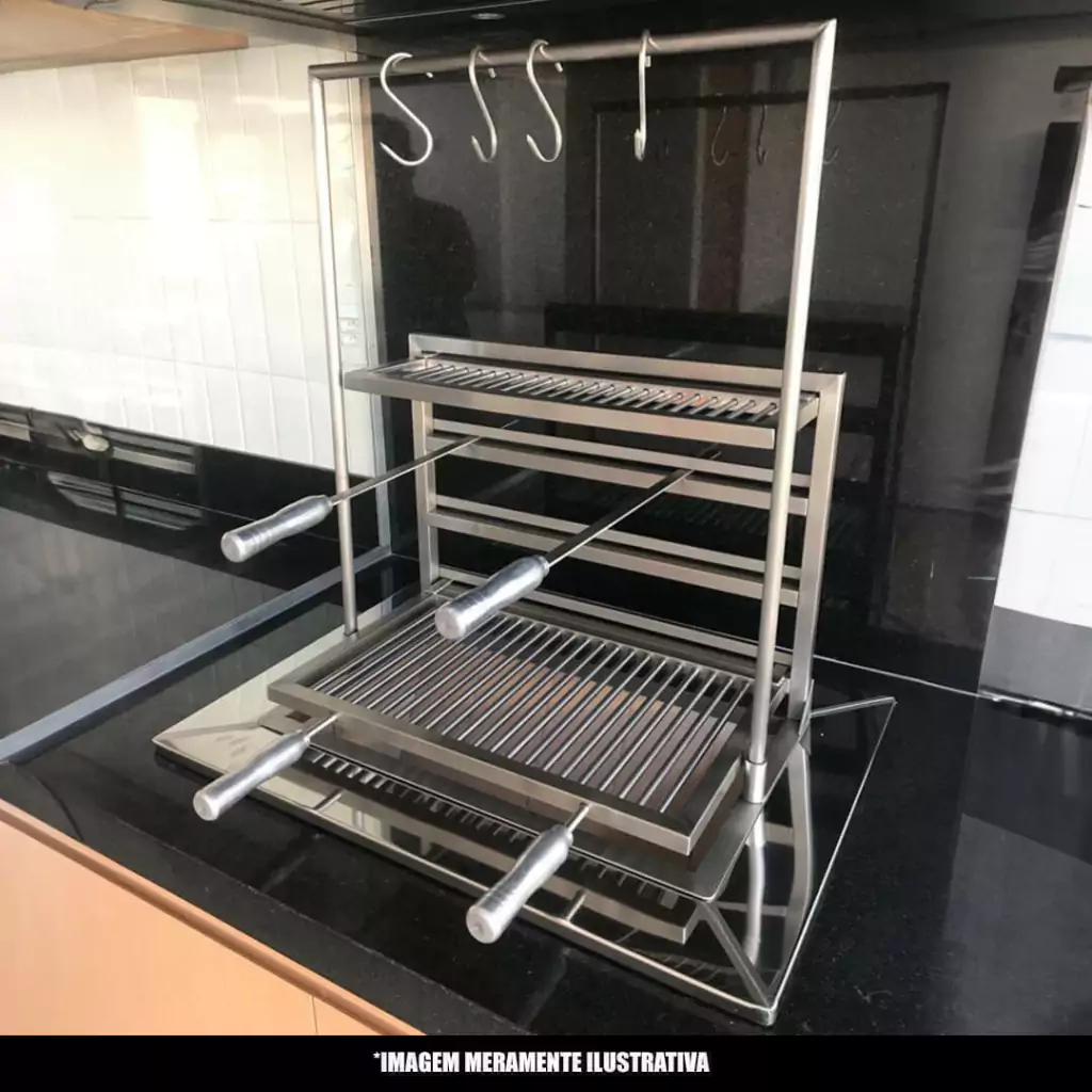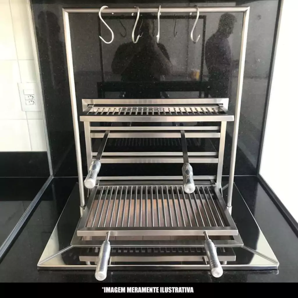Acompanha: 1 Grelha Principal / 1 Grelha de Apoio / Varal / 3 Espeto Simples / 1 Espeto Duplo / Estrutura de Espeto Suspenso / Cantoneira de Base.